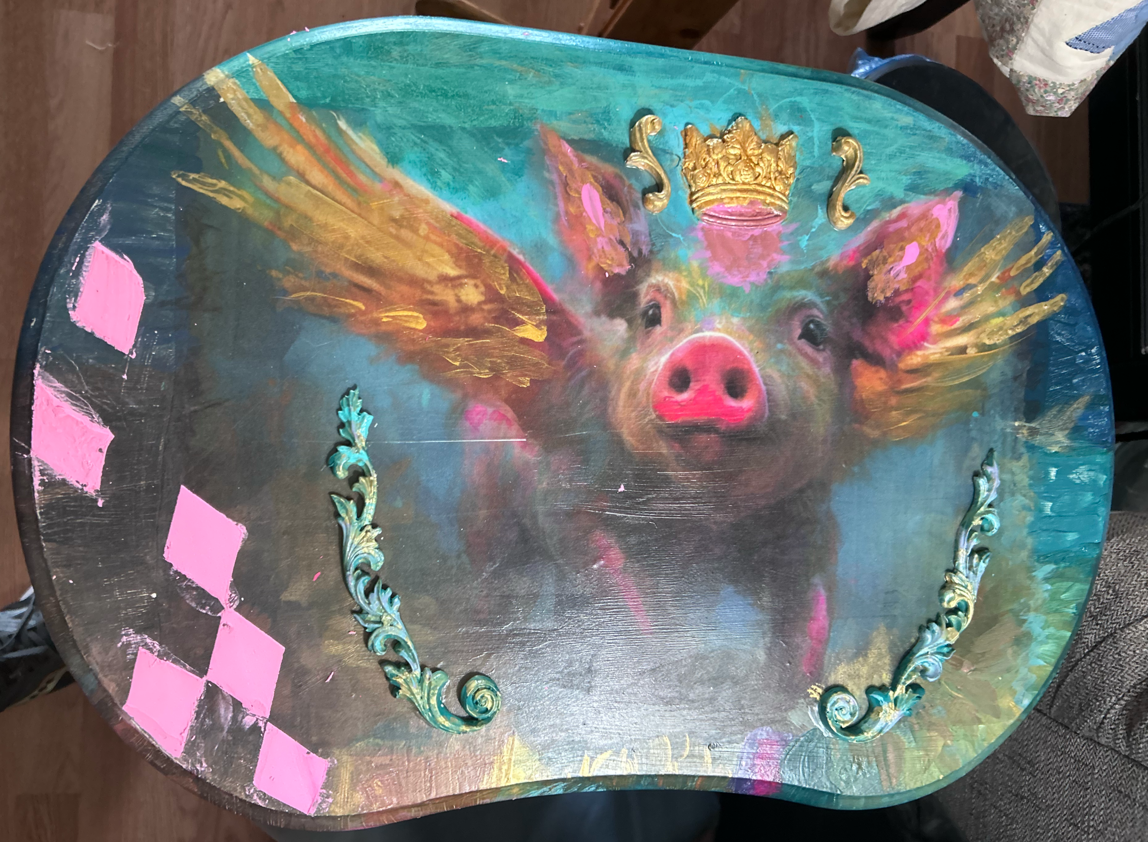 I also decoupage, paint, and embellish furniture of various types. Dressers, nightstands, coffee tables, armoirs, chairs and headboards are examples of items that I have worked on.